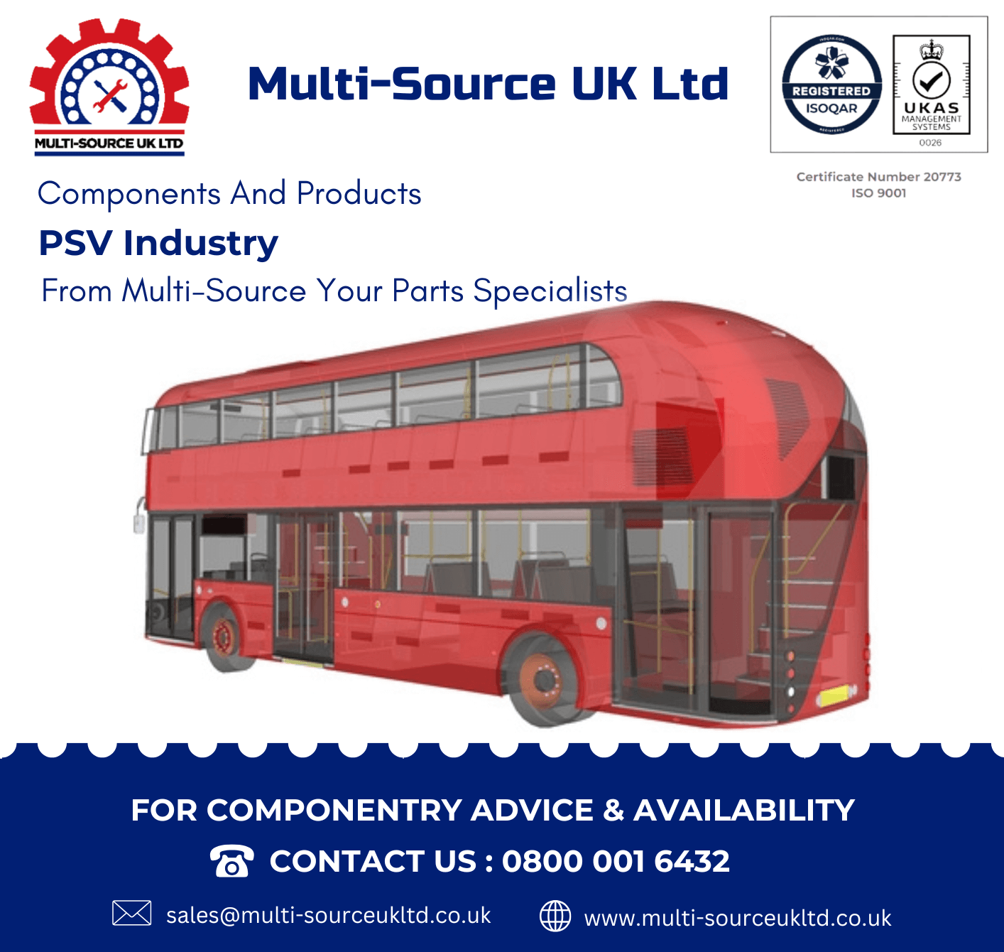 Multisource UK Ltd are a parts procurement specialist we operate in the supply of products to many markets, one of which is the PSV Industry. We have many years of experience and knowledge of parts supply to the Bus sector. Our product is procured from an extensive supplier base, which ensures continuity both on availability and quality of supply. Our component range facilitates (An All-makes PSV offering) and can be moved on a next-day basis around the UK. Multisource UK hold ISO 9001 certification status and therefore performs and trades within the parameters of this discipline.
